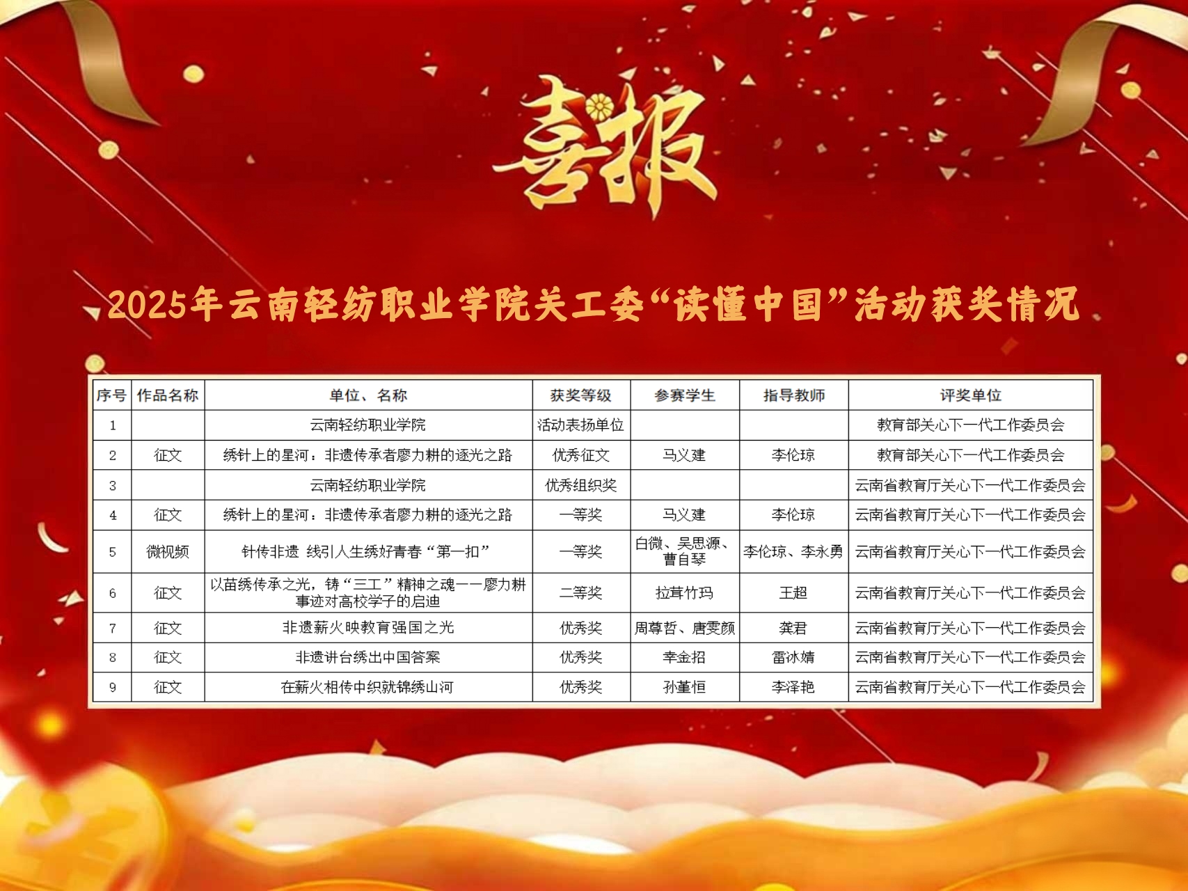 此次评选,世俱杯sjb成果丰硕。学校获评教育部“读懂中国”活动表扬单位与云南省“读懂中国”活动优秀组织奖,双重荣誉彰显组织实力;征文《绣针上的星河:非遗传承者廖力耕的逐光之路》喜获部级优秀征文与省级一等奖,成为本次活动的亮眼佳作。此外,省级奖项收获颇丰,微视频《针传非遗线引人生...